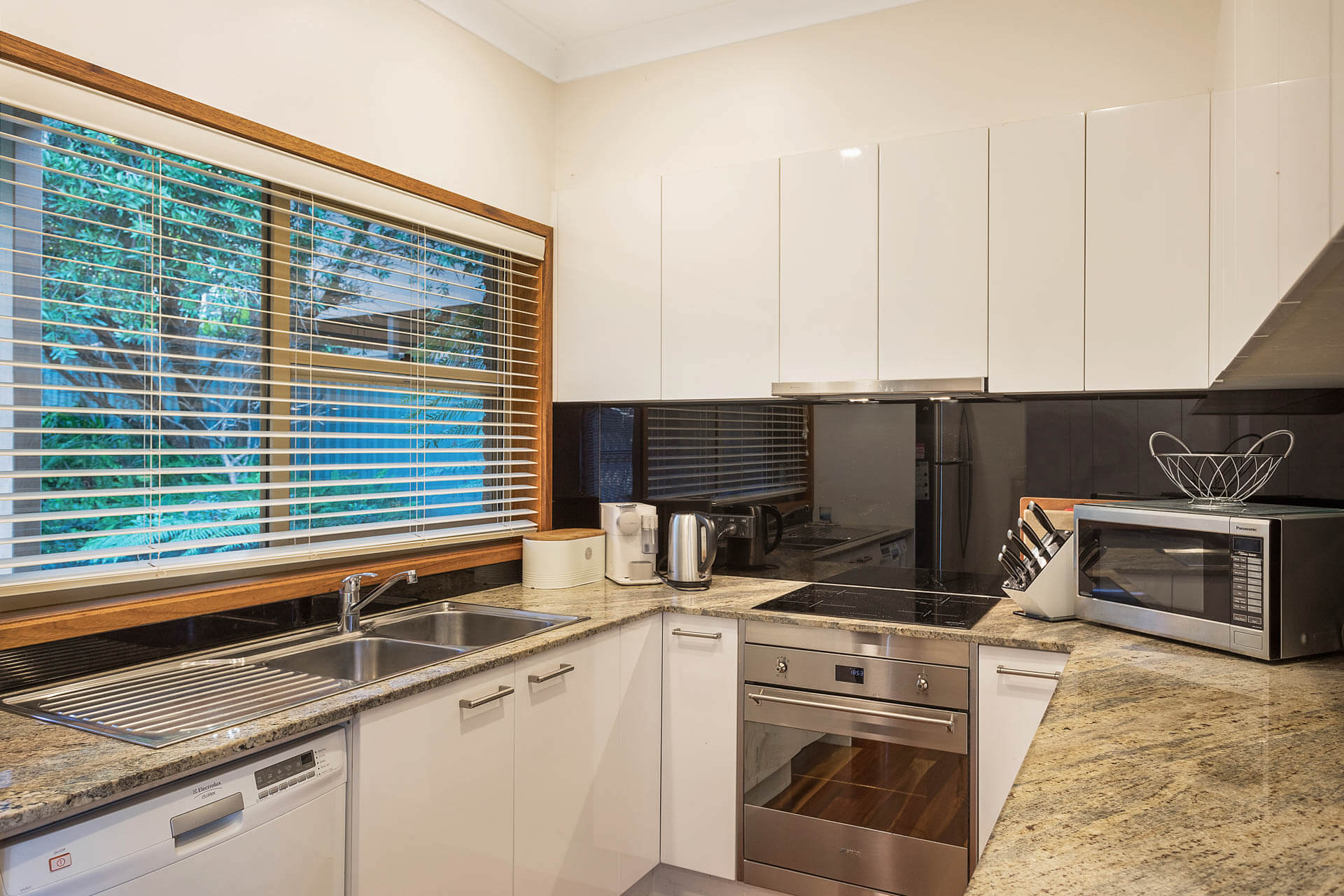 There is one bathroom downstairs (with bath and separate toilet) and one bathroom upstairs. There is also an additional outdoor shower. The kitchen is well equipped, with all your modern conveniences which includes a dishwasher and coffee pod machine.