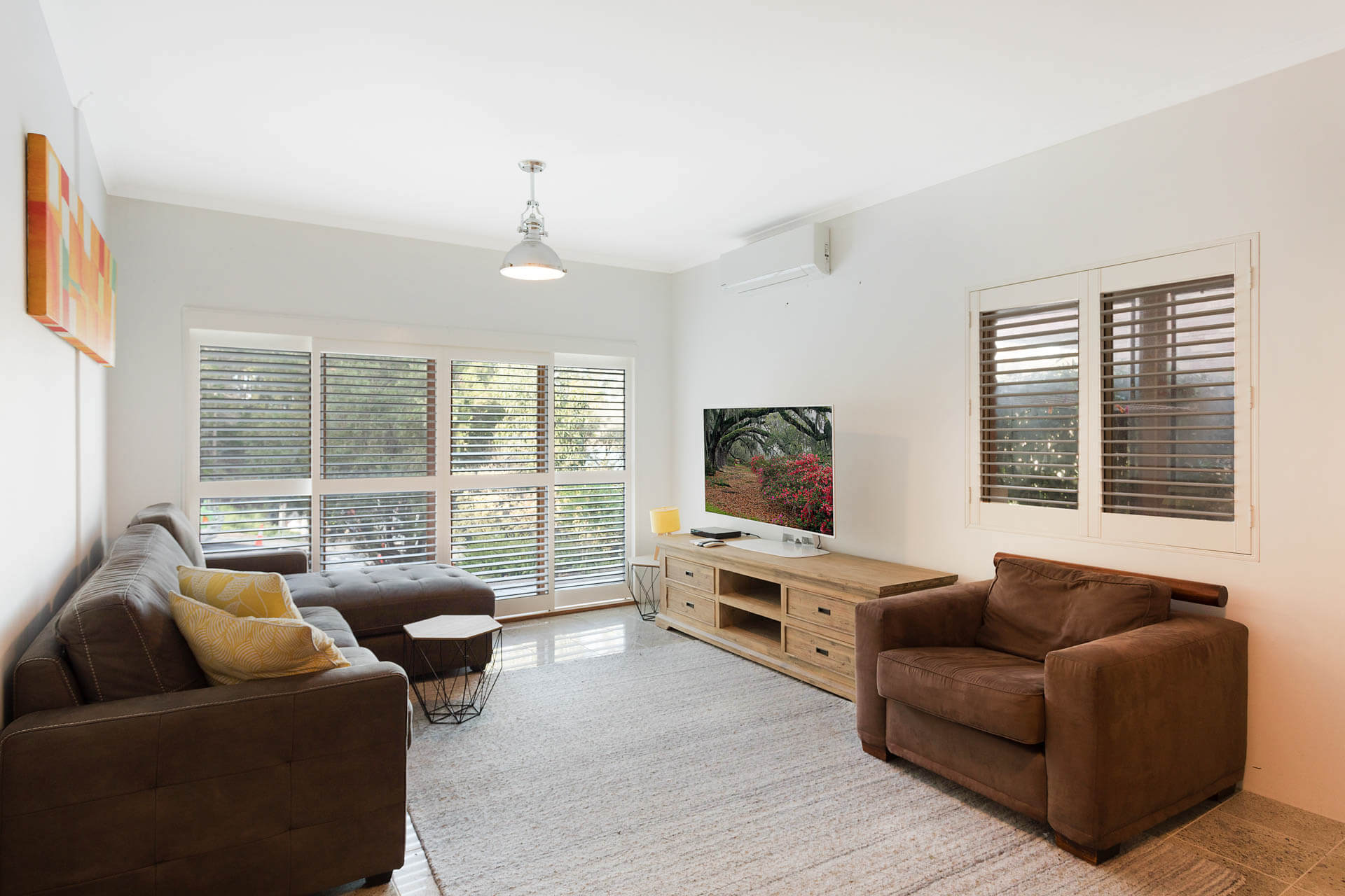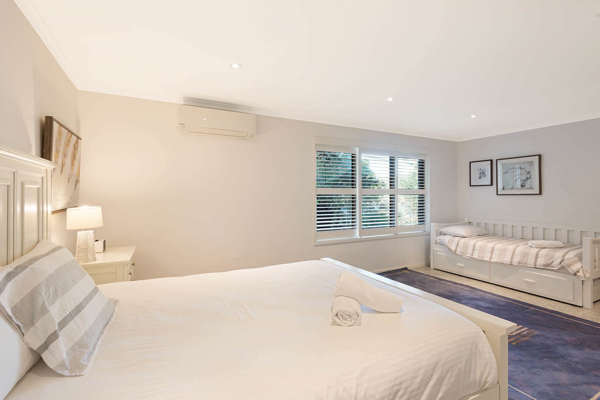 - Bedroom 1 (downstairs) has 1 x queen bed and 1 x single bed and water views and reverse cycle air-conditioning