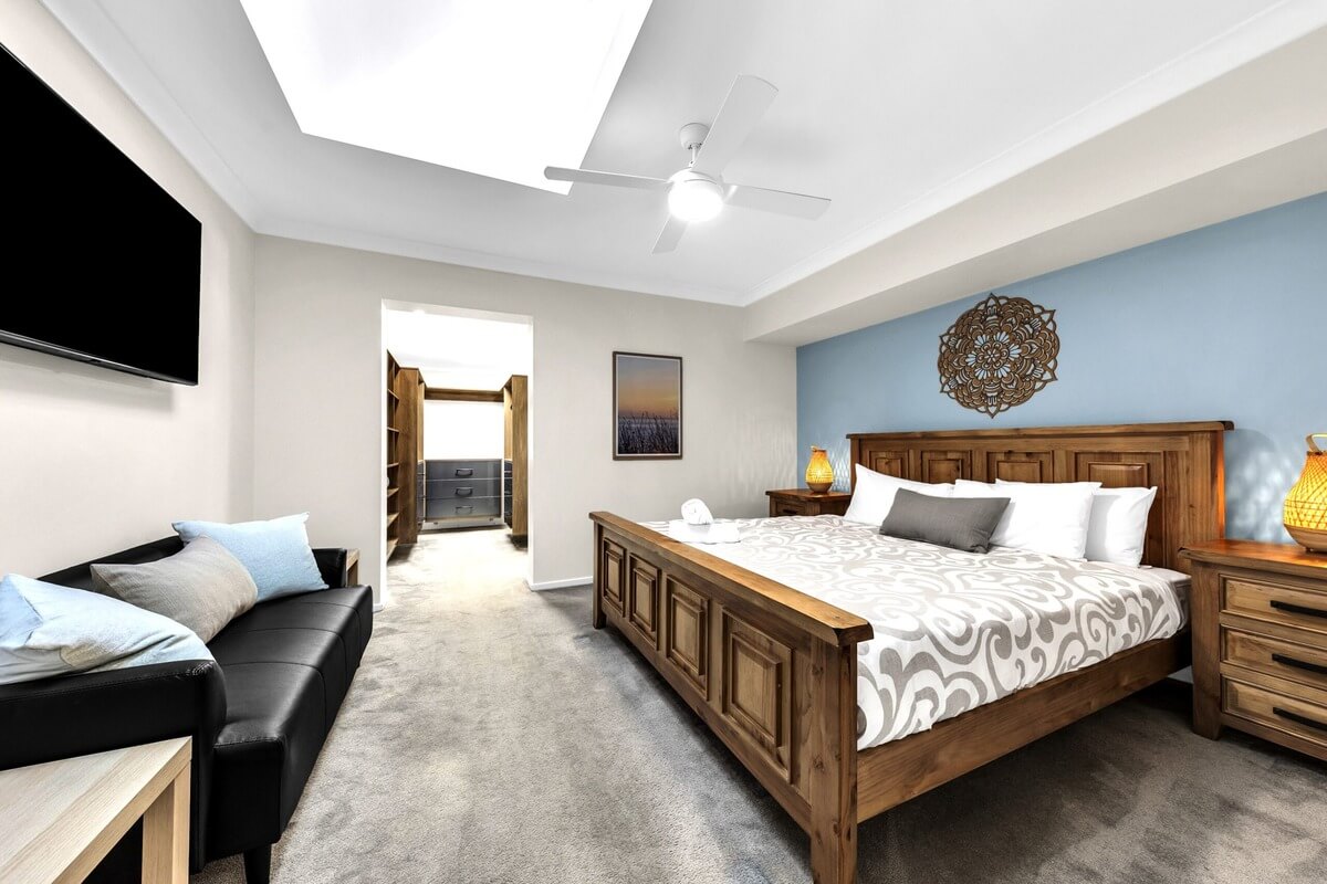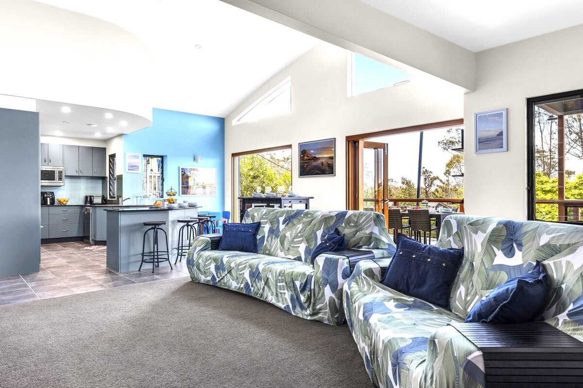 Enjoy the sun filled large living area, that boasts ceiling high windows with access through bi-folding doors out on the spacious deck, shaded by sails. The fully equipped kitchen is fitted with all the modern appliances and cooking utensils you will need. There are 4 large bedrooms, the master is home to a king-sized bed, smart TV, a sky light, walk in robe and ensuite with toilet and shower. The second and third bedrooms are also home to king-sized beds, built in wardrobes and large light filling windows. The fourth bedroom is the perfect kids room, home to 2x king single beds and a king single trundle (Sleeping 3).