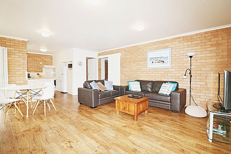 This unit (Apartment 1) has a queen bed and 2 single beds. Apartment 1 is the only apartment in the complex that boasts its own large, private fully fenced yard and is ground level. This Apartment has all the at home necessities including, Fully equipped kitchen, dishwasher, microwave, induction or ceramic hot plates and oven. Free WIFI, reverse cycle air-conditioning, large flat screen TV, dvd player and music system and your own BBQ. Enjoy the newly renovated laundry and bathroom, including a walk in shower.
