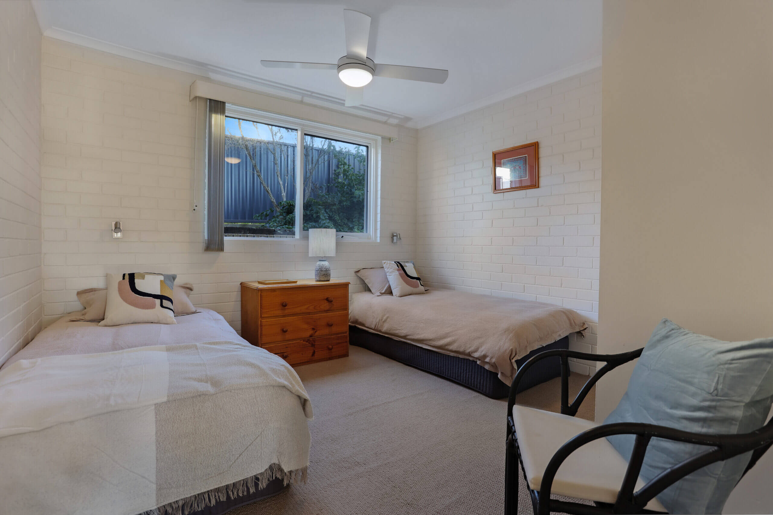 The charming second bedroom offers two single beds, bedside table and chest of drawers.