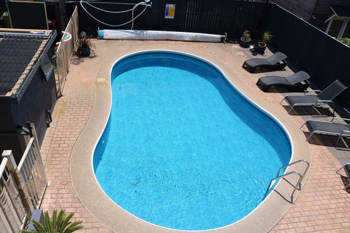 The light-filled flat features water glimpses, two spacious bedrooms, an open plan kitchen, living and dining area, dining table with water views, tidy bathroom, compact laundry, outdoor area, and a sunny, private poolside area with heated pool and gorgeous lounges to chill.